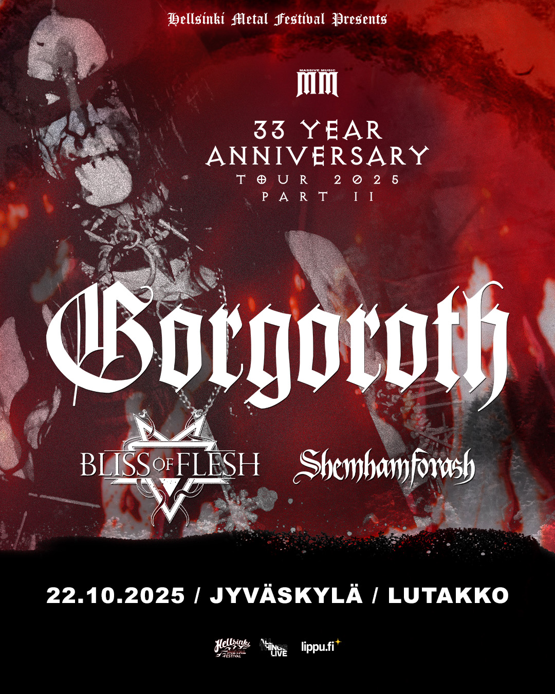Vuonna 1992 perustettu Gorgoroth juhlistaa yhtyeen 33-vuotista taivalta tekemällä juhlakiertueen Skandinaviassa ja Baltian maissa lokakuussa. Tämä kiertue ulottuu myös Suomeen, johon norjalaiset rantautuvat ensin Jyväskylän Lutakkoon 22. lokakuuta, jatkaen matkaansa siitä seuraavana päivänä Helsingin Ääniwalliin. Mukana matkaa kaksi lämmittelijää; Bliss of Flesh sekä Shemhamforas.