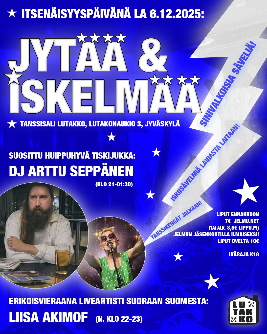 DJ Arttu Seppäsen Jytää ja iskelmää -disko jo toista vuotta putkeen itsenäisyyspäivänä Lutakossa! Livevieraana tällä kertaa yhden naisen ihmeellinen syntikkadisko (ja vähän muutakin) Liisa Akimof.